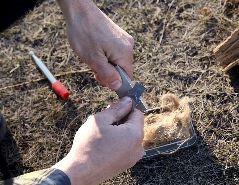 - enthält Zündstahl, Schaber, Magnesiumblock, Blasrohr und Jute