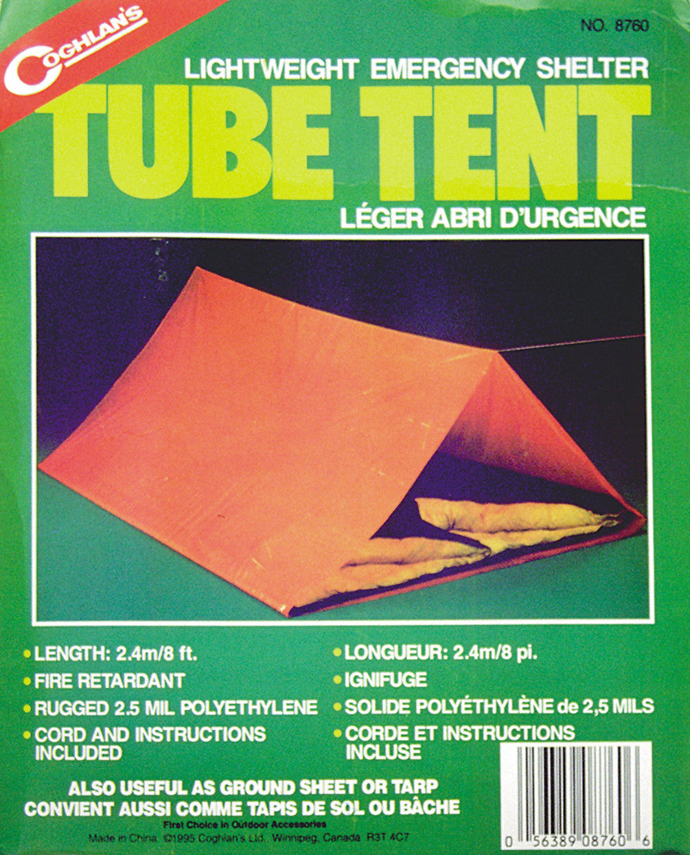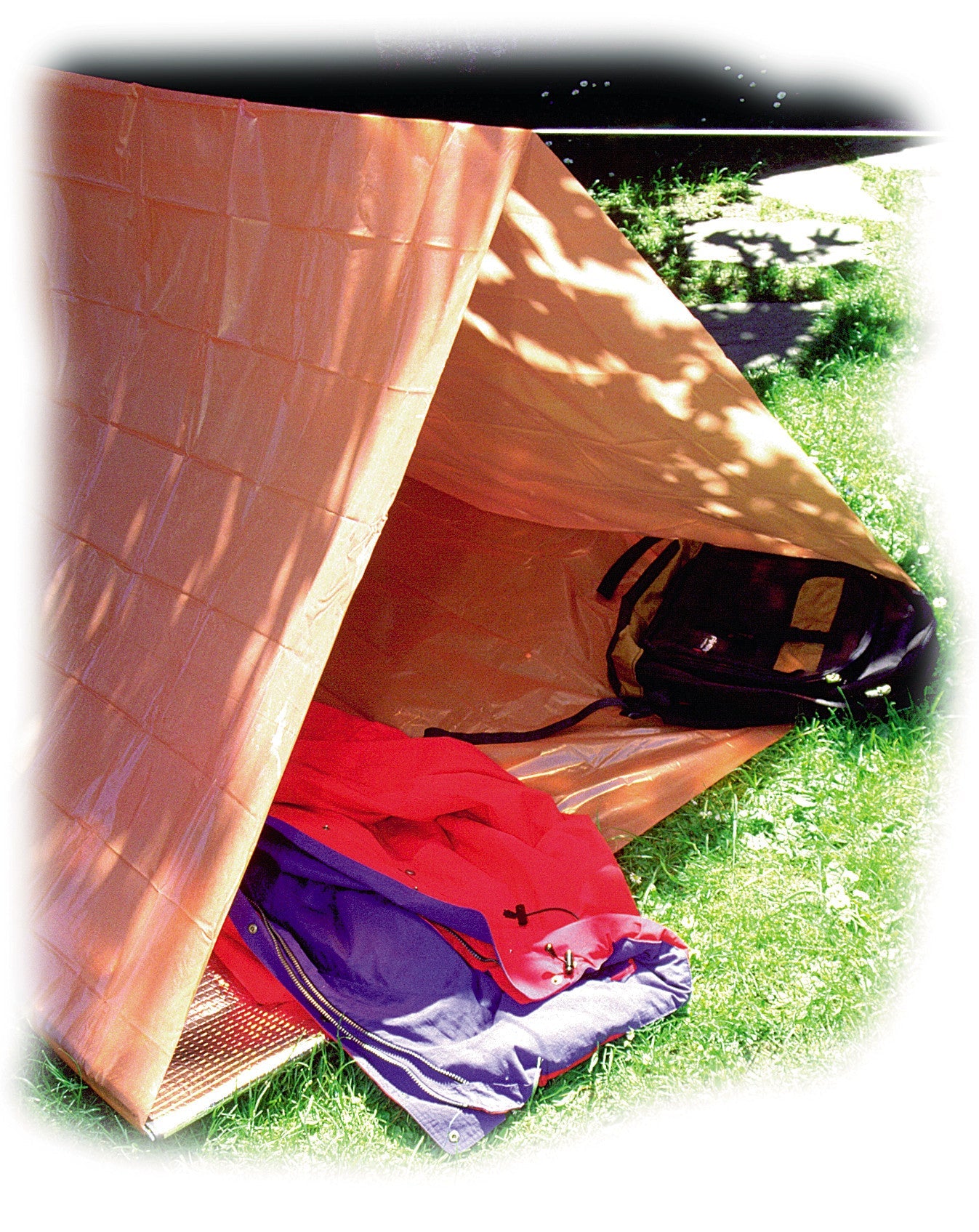 Leichtgewichts-'Notzelt' aus stabilem, feuerabweisendem Polyethylen. Bietet Platz für 2 Personen und schützt vor Regen und Wind. Vielseitige Anwendungen sind möglich, auch als Unterlegplane geeignet. "