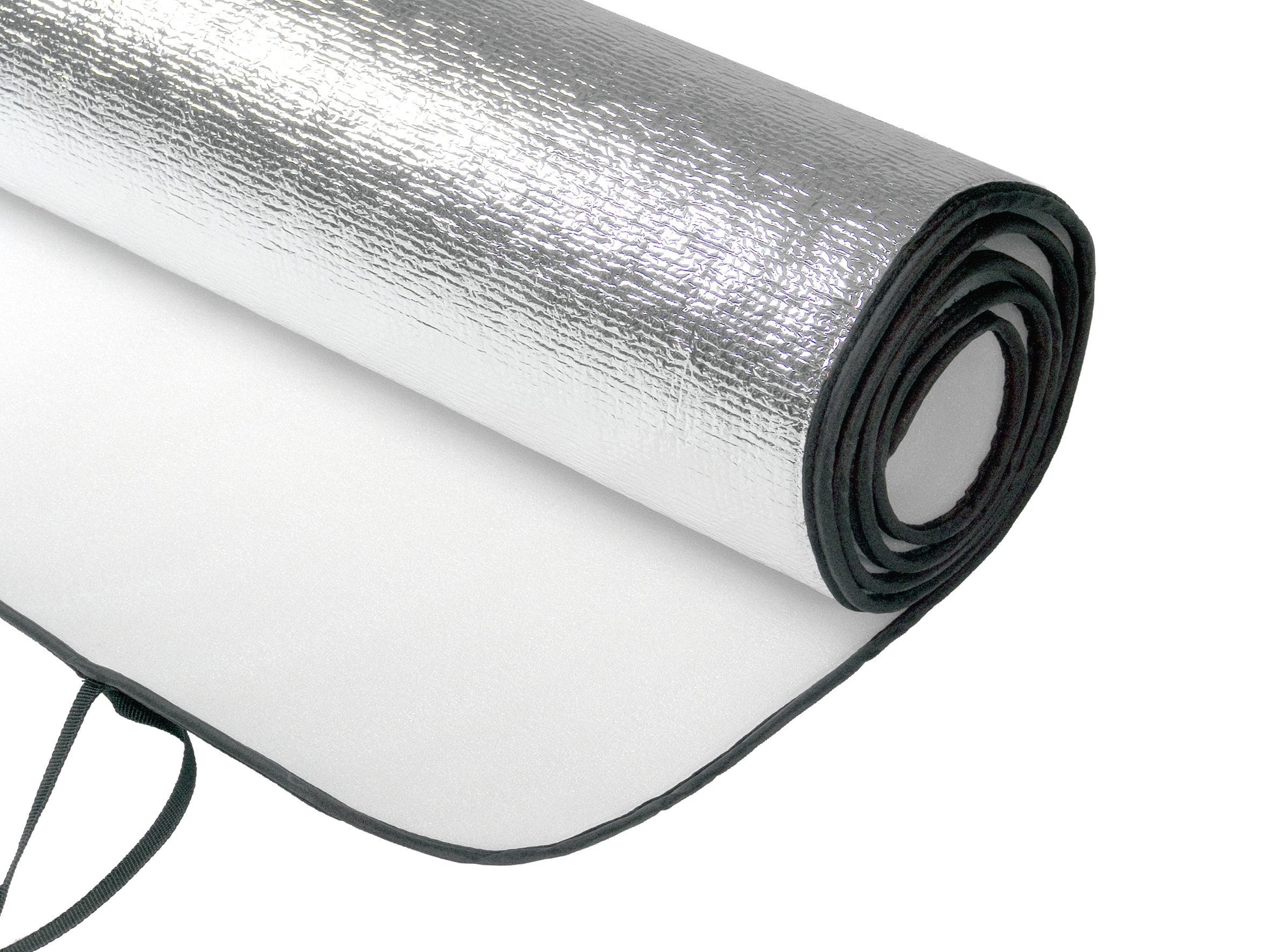 Isolierende Unterlage mit PE-Schaumeinlage, Alubeschichtung und 'Unterbodenschutz'.