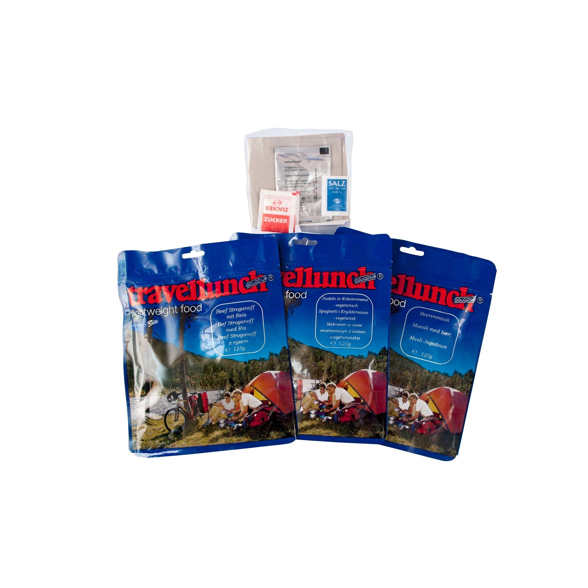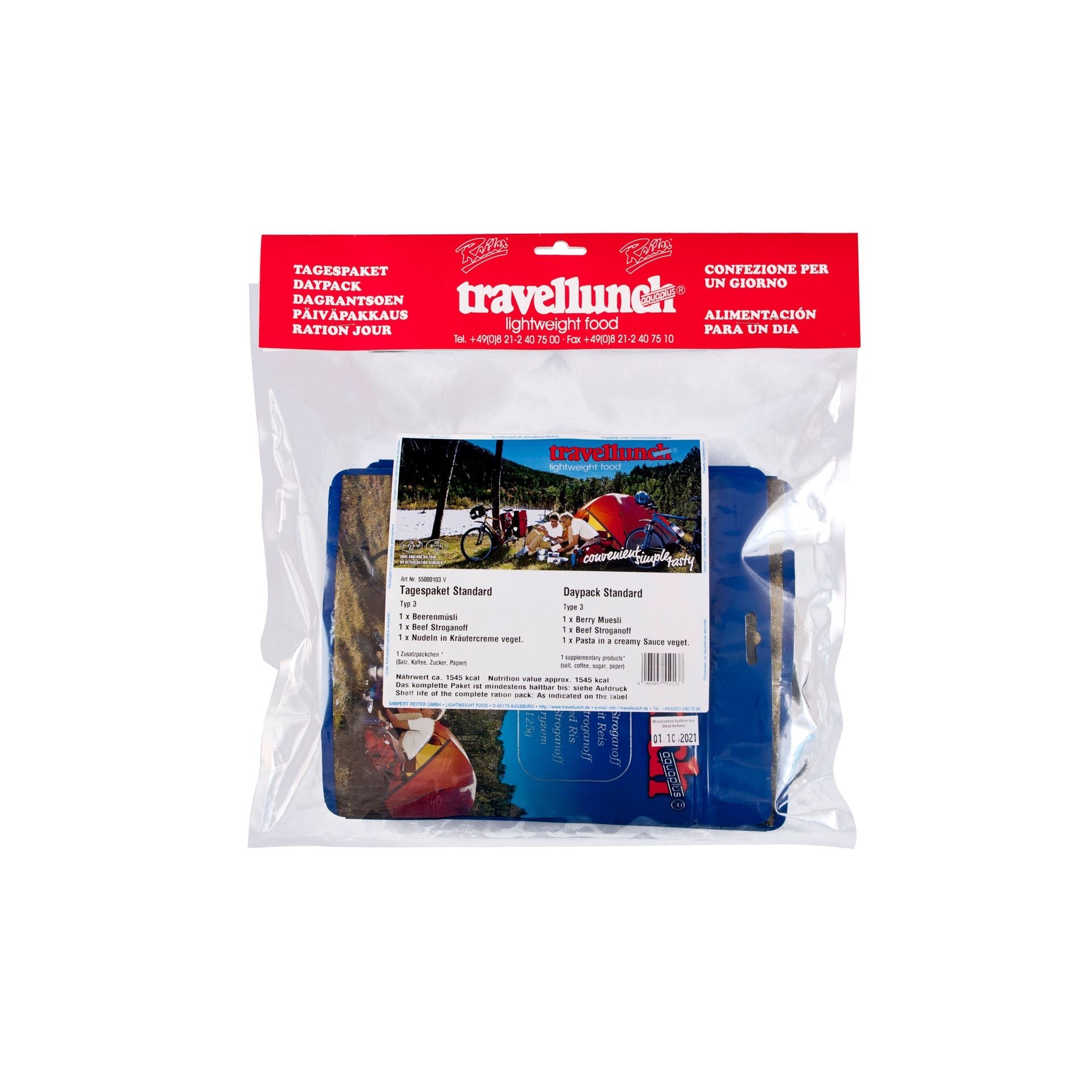 Das Travellunch Tagespaket in einer besonders lange haltbaren Ausführung. Mit einer Kalorienanzahl für normale körperliche Beanspruchung in Regionen mit gemäßigtem Klima. Mit einem Paket hat man bequem, sicher und extrem leicht die Nahrung für einen ganzen Tag dabei. Reicht für 3 Mahlzeiten eines durchschnittlichen Erwachsenen. Die Mahlzeiten sind in Deutschland aus guten, gefriergetrockneten und kontrollierten Zutaten hergestellt. Sie sind extrem leicht und unkompliziert zu transportieren, 4 Jahre ungekühlt haltbar und schnell zubereitet.